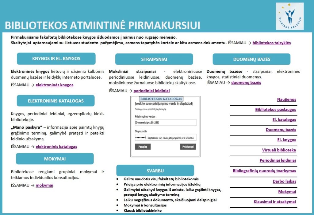 Dėmesio! Trumpai ir aiškiai galite susipažinti su pagrindinėmis bibliotekos funkcijomis, teikiamomis paslaugomis ir kitais bibliotekos niuansais Atmintinėje pirmakursiams.
