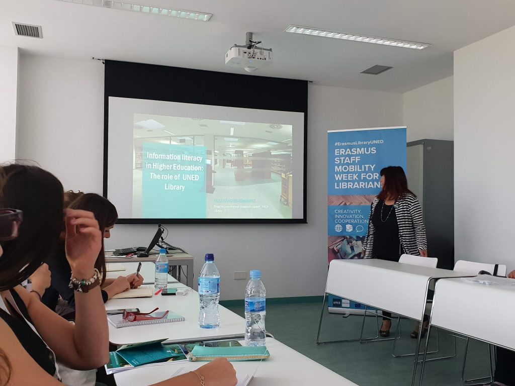 Bibliotekų personalo mokymo savaitėje dalyvavo 17 bibliotekininkų iš įvairių šalių. Mokymų savaitės metu dalyviai pristatė save ir savo institucijas, dalijosi profesine patirtimi, susipažino su UNED bibliotekos veikla, informacinio raštingumo vizija ir strategija, dalyvavo seminaruose ir diskusijose apie skaitmeninio amžiaus iššūkius bibliotekai, apie bibliotekų bendradarbiavimą siekiant įveikti šiuos iššūkius. Dalyviai aplankė UNED archyvą, vizito meto pristatyta jo veikla ir vykdomos funkcijos. Taip pat dalyviai turėjo galimybę pasimokyti ir ispanų kalbos. Vizito metu aplankyta išties daug ir skirtingų bibliotekų: UNED centrinė ir fakultetų bibliotekos, Ispanijos nacionalinė biblioteka, Senato biblioteka, Reina Sofía muziejaus bibliotekos ir dokumentacijos centras.