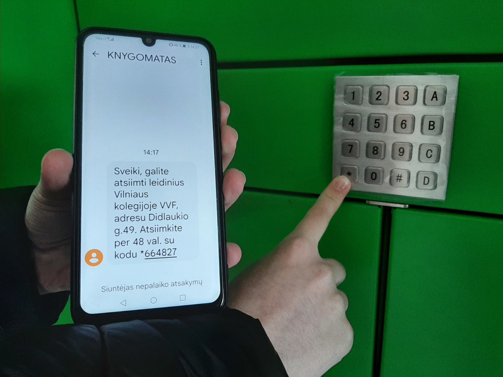 - Knygomato klaviatūroje spauskite žvaigždutę (*), sulaukite garsinio signalo ir įveskite SMS žinutėje gautą atsiėmimo kodą. Leidinius būtina atsiimti per 48 val.