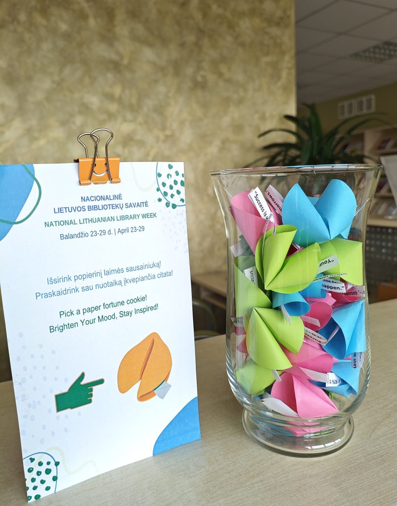 Bibliotekų savaitės metu užsuk į EIF, SPF ir VVF bibliotekas bei išsirink spalvotą popierinį laimės sausainuką. Jame atrasi tau skirtą motyvuojančią, įkvepiančią ar nuotaikingą žinutę.